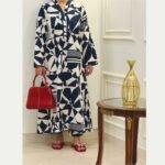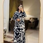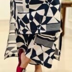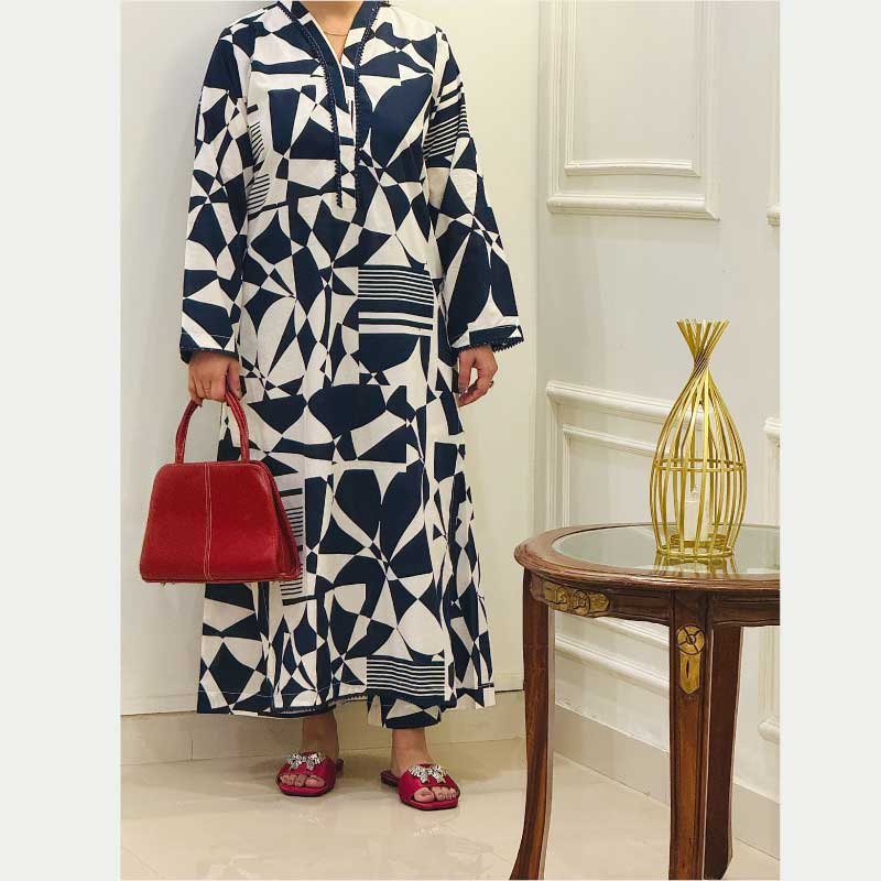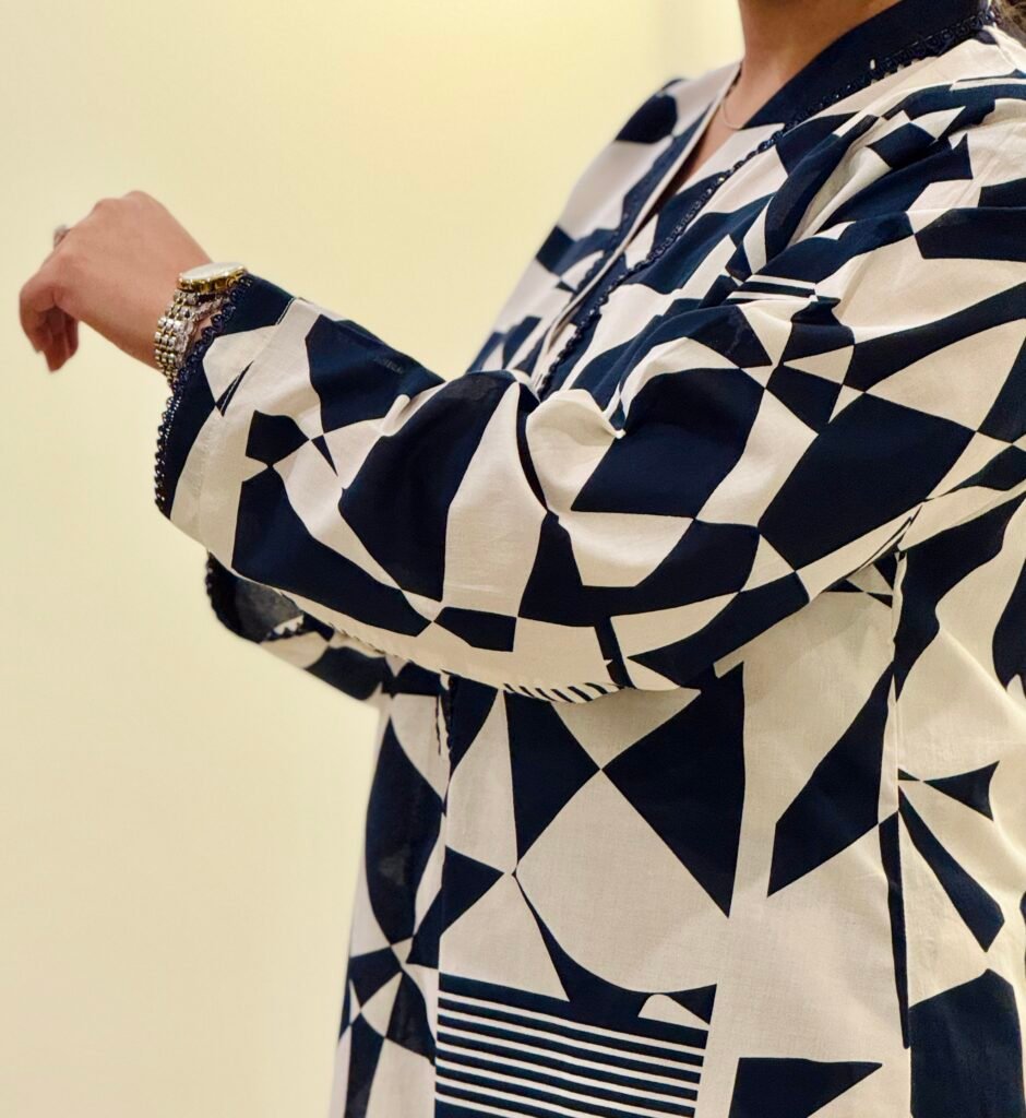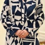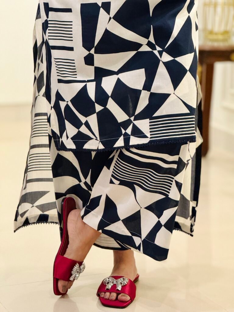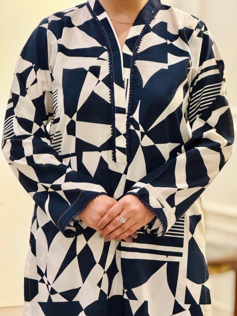 Abstract Rhythm is a contemporary printed two-piece lawn suit designed for effortless everyday style. Crafted from high-quality breathable lawn fabric, it offers a soft, lightweight feel for day-long comfort. The long shirt features an abstract navy blue and white pattern, complemented by a refined Chinese collar neckline with delicate lace detailing. Lace accents are also added on the front hem and sleeves, creating a polished look while maintaining visual balance. Paired with straight box trousers, the outfit delivers a clean, modern silhouette suitable for daily wear, casual outings, and semi-formal occasions.